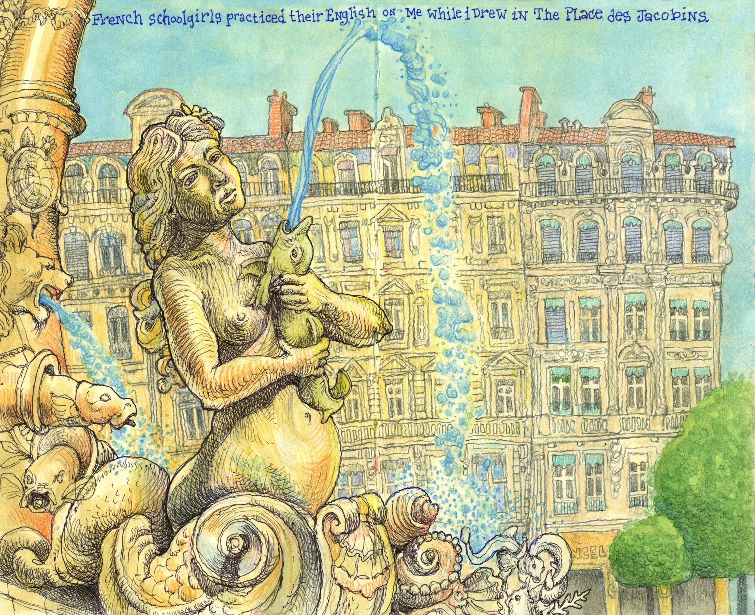 I drew with my cohorts, Jean-Christophe Defline, Arnaud De Meyer, Mauro Duro, and Jean Luc. We sketched the fountain in Place des Jacobins. The background I drew on train rides through the Alps from a photo I snapped. I tried to create an image that looked like an aged photograph. The background I did all in colored pencil that I made look soft and out of focus, almost like an old Kodachrome image taken in the 1950s.