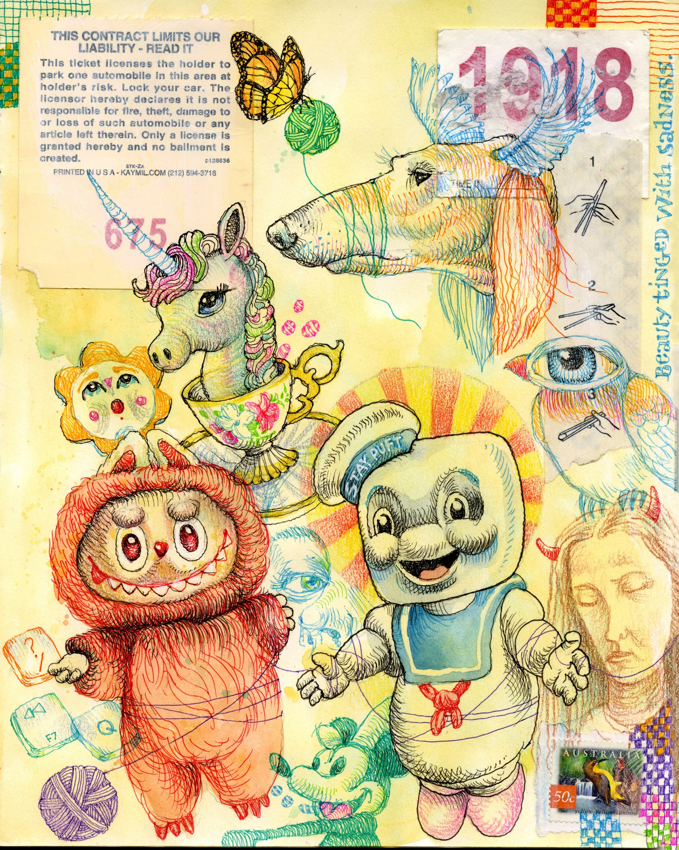 Art doesn’t always make sense. There are times it’s not very linear. This piece is a fine example. My mom turned 90 in September. Recently she took a spill and cracked her head needing eight stiches. I drove to North Carolina to check her out. She was unfazed by her brusing. This is the drawing I created as a result of that trip. My niece’s Labudu doll and a Stay Puft sculpture that was living in my sister’s kitchen made it in. Maybe one of you can explain it to me.