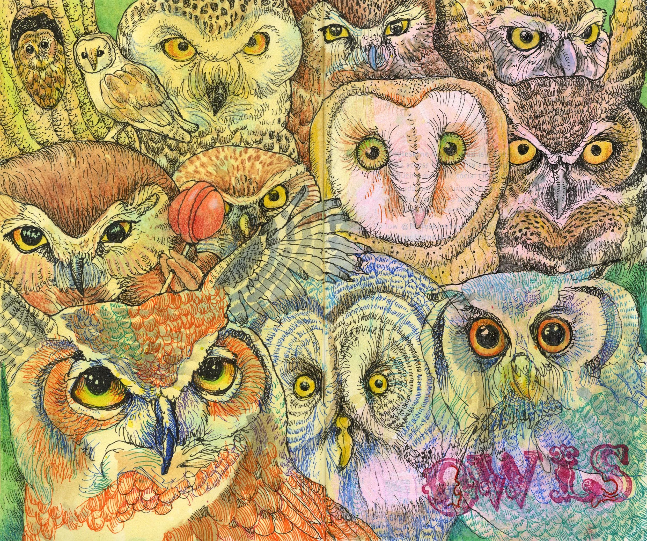 The first book I read by Jennifer Ackerman was The Genius of Birds. I followed that up with her book, What An Owl Know. That inspired me to make this drawing. While hiking in Olympic National Park I was able to identify some owl scat on the base of a tree or two, letting me know an owl was perched way up high somewhere in that giant tree. I also know that after the Harry Potter films came out, too many people in too many countries bought owls as pets only to release them into the wild weeks later because they didn’t realize how difficult it would be to maintain them. Scientists made JK Rowling issue a statement to folks not to buy owls.