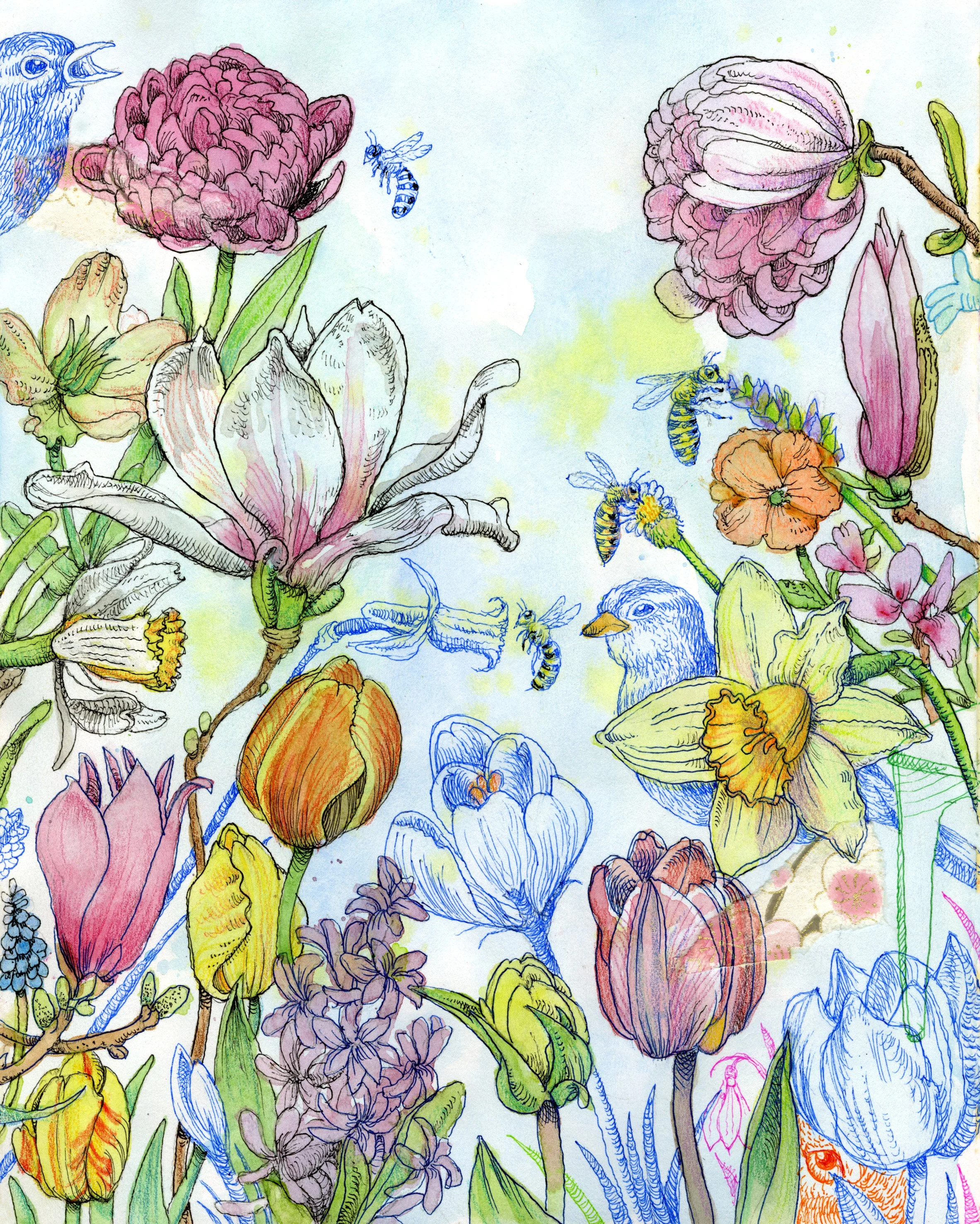 Every spring, I make a new version of this same type of flower drawing. I went to the Botanical Gardens on three separate occasions to get this many blooms onto my page. Plus some days it was quite cold to stay out there. When I’m finished, I always think this is the best one I’ve ever done. Probably not true but I love my little sketch anyway.